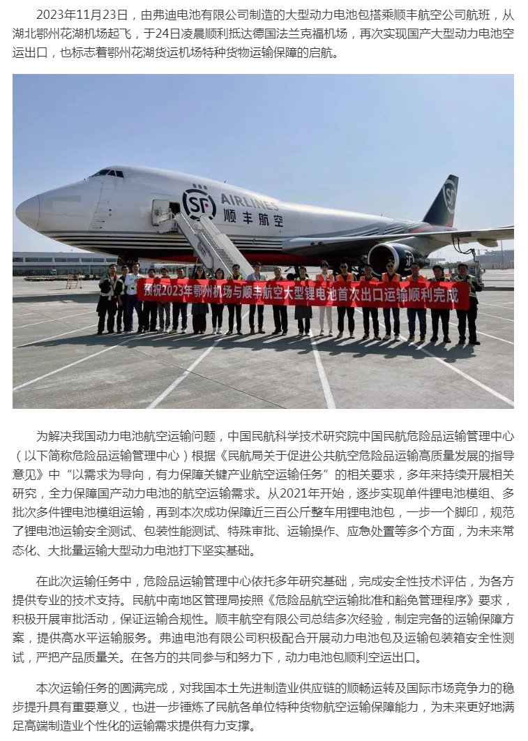 航科院持续保障国产大型动力电池空运出口