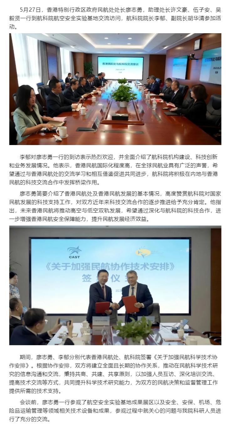 航科院与香港民航处会谈交流签署《关于加强民航科学技术协作安排》